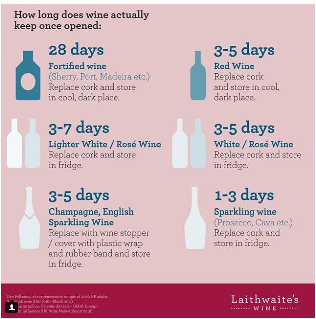 Laithwaite khuyên rằng hầu hết các loại rượu vang vẫn tươi cho khoảng 3-5 ngày - lâu hơn thế, và oxy sẽ tương tác với rượu vang và tác động đến hương vị.